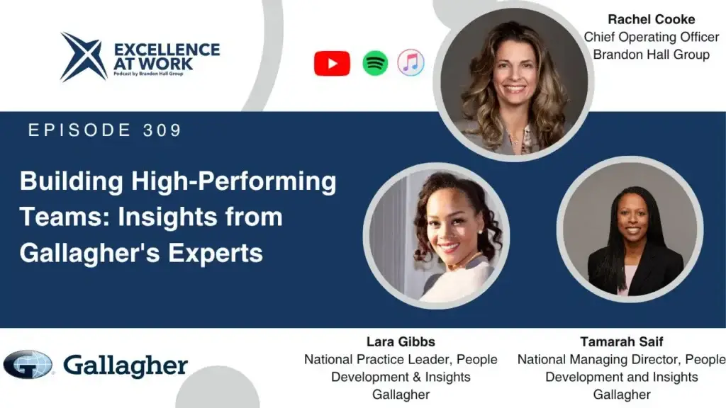 This Executive Interview about building high-performing teams features Tamarah Saif and Lara Gibbs of Gallagher in conversation with Brandon Hall Group™ CEO Rachel Cooke. The discussion explores how organizations can strengthen team effectiveness through psychometric assessments, distributed leadership, and co-created team charters that align individual contributions to strategic goals.
